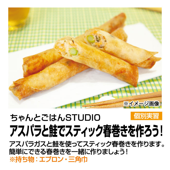講座内容:アスパラガスと鮭を使ってスティック春巻きを作ります。簡単にできる春巻きを一緒に作りましょう!※持ち物:エプロン・三角巾