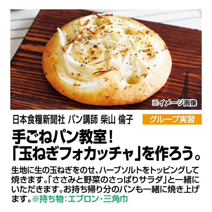 講座内容:生地に生の玉ねぎをのせ、ハーブソルトをトッピングして焼きます。「ささみと野菜のさっぱりサラダ」と一緒にいただきます。お持ち帰り分のパンも一緒に焼き上げます。※持ち物:エプロン、三角巾
