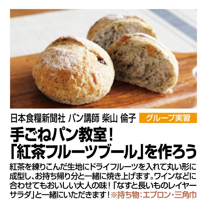 講座内容:紅茶を練りこんだ生地にドライフルーツを入れて丸い形に成型し、お持ち帰り分と一緒に焼き上げます。ワインなどに合わせてもおいしい大人の味!「なすと長いものレイヤーサラダ」と一緒にいただきます!※持ち物:エプロン・三角巾