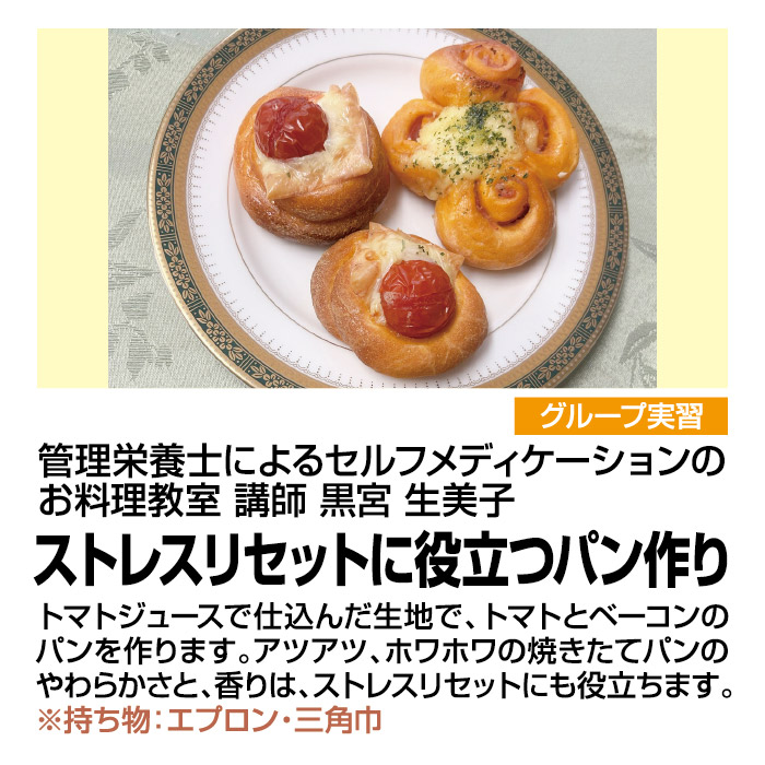 講座内容:トマトジュースで仕込んだ生地で、トマトとベーコンのパンを作ります。ほんのり温かく、やわらかいパン生地の蝕感と、パンの焼けるおいしい香りは、ストレスリセットにも役立ちます。※持ち物:エプロン・三角巾