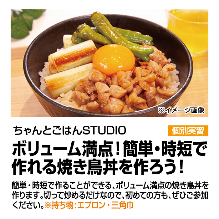 講座内容:簡単・時短で作ることができる、ボリューム満点の焼き鳥丼を作ります。切って炒めるだけなので、初めての方も、ぜひご参加ください。※持ち物:エプロン・三角巾