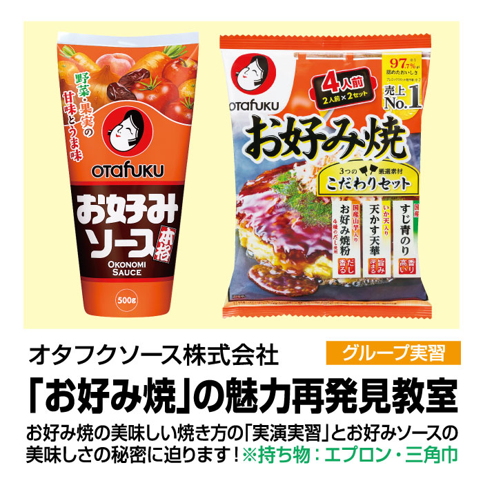 講座内容:美味しいお好み焼の焼き方を実演を交えて教室を実施。また家族で楽しくお好み焼を焼いて頂けるように、マヨネーズを使用してオコアートを実際に楽しんで頂きます。※持ち物:エプロン、三角巾
