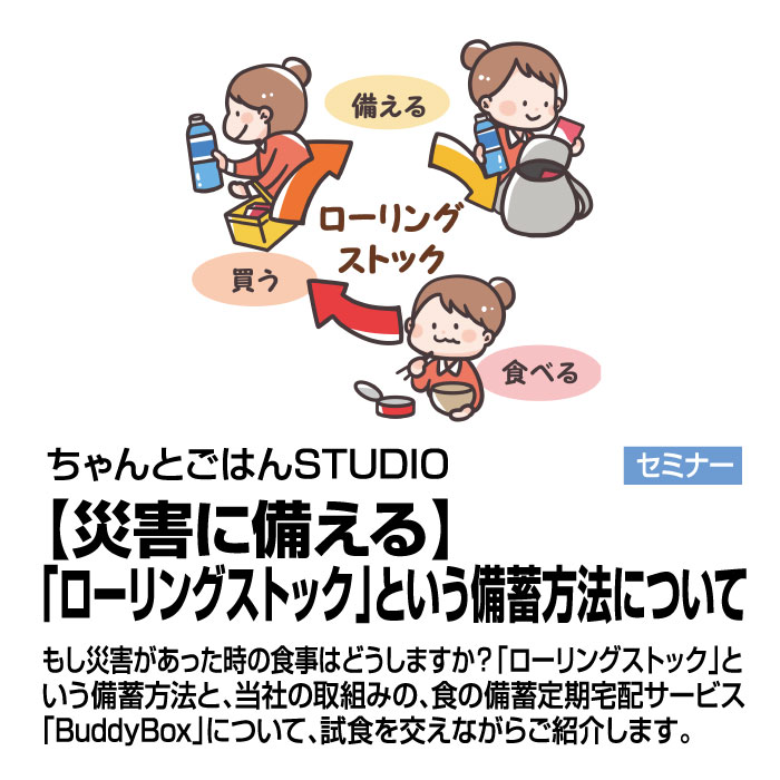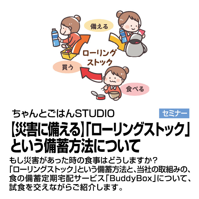 講座内容:もし災害があった時の食事はどうしますか?「ローリングストック」という備蓄方法と、当社の取組みの、食の備蓄定期宅配サービス「BuddyBox」について、試食を交えながらご紹介します。