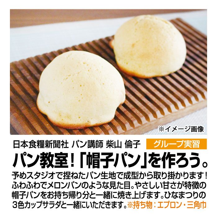 講座内容:予めスタジオで捏ねたパン生地で成型から取り掛かります!ふわふわでメロンパンのような見た目。やさしい甘さが特徴の帽子パンをお持ち帰り分と一緒に焼き上げます。ひなまつりの4色カップサラダと一緒にいただきます。※持ち物:エプロン・三角巾