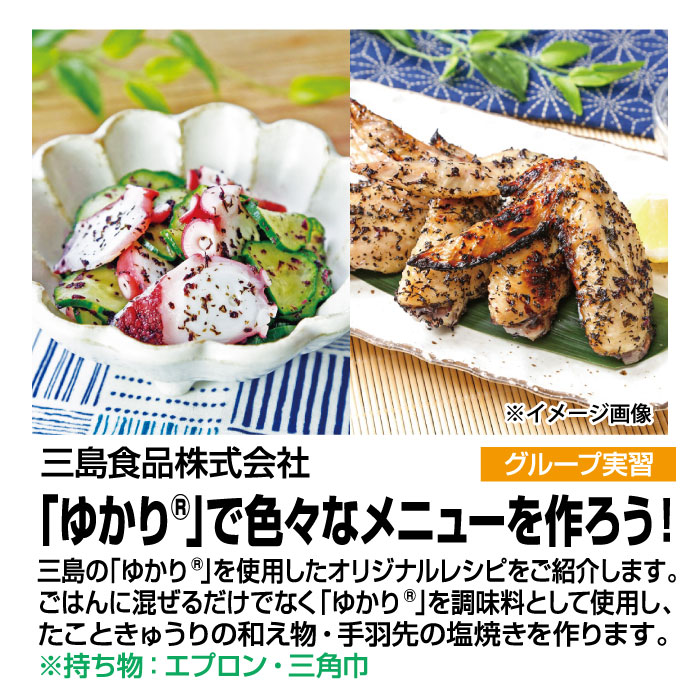 ごはんに混ぜるだけでなく「ゆかり®」を調味料として使用し、たこときゅうりの和え物・手羽先の塩焼きを作ります。※持ち物:エプロン、三角巾