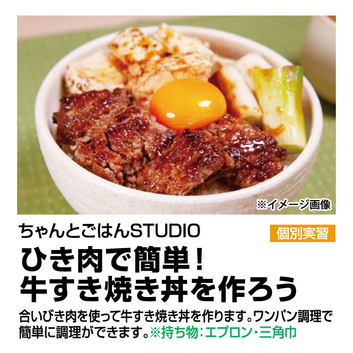 講座内容:合いびき肉を使って牛すき焼き丼を作ります。ワンパン調理で簡単に調理ができます。