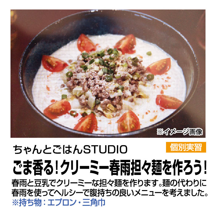 講座内容:春雨と豆乳でクリーミーな担々麺を作ります。麺の代わりに春雨を使ってヘルシーで腹持ちの良いメニューを考えました。※持ち物※エプロン・三角巾