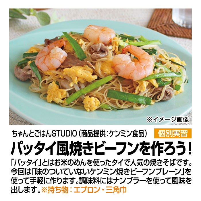 講座内容:「パッタイ」とはお米のめんを使ったタイで人気の焼きそばです。今回は「味のついていないケンミン焼きビーフンプレーンを」使って手軽に作ります。調味料にはナンプラーを使って風味を出します。※持ち物:エプロン・三角巾