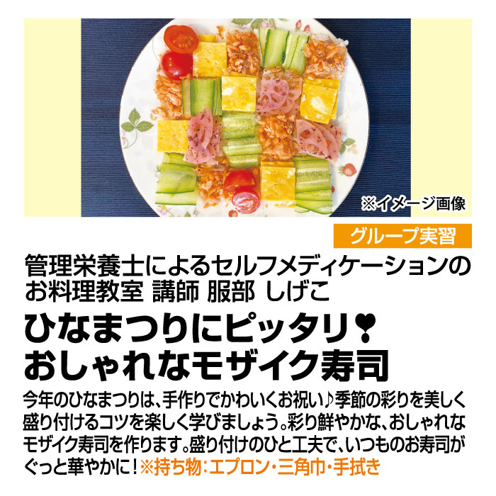 講座内容:今年のひなまつりは、手作りでかわいくお祝い♪季節の彩りを美しく盛り付けるコツを楽しく学びましょう。彩り鮮やかな、おしゃれなモザイク寿司を作ります。盛り付けのひと工夫で、いつものお寿司がぐっと華やかに!