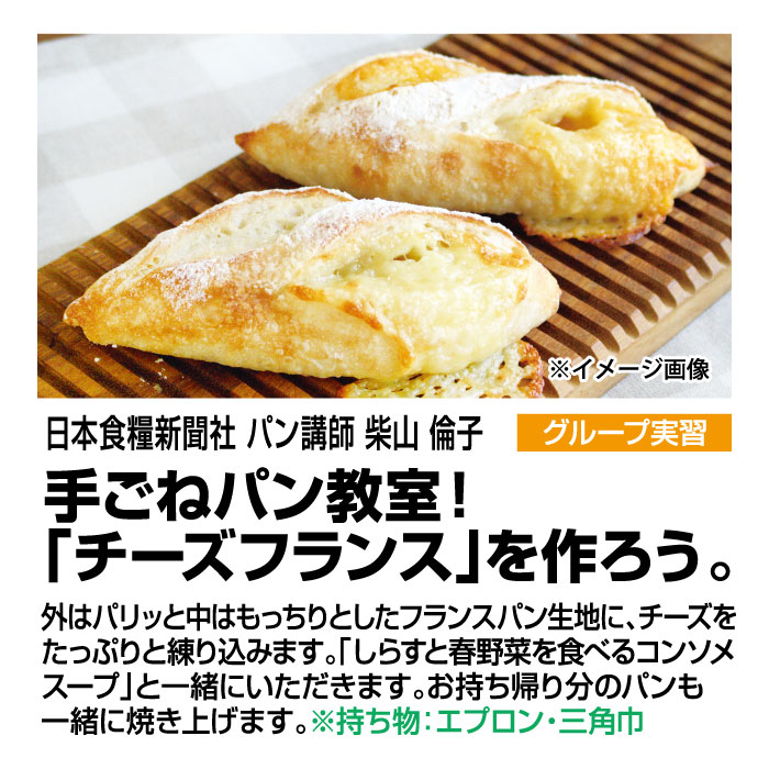 講座内容:外はパリッと中はもっちりとしたフランスパン生地に、チーズをたっぷりと練り込みまる。「しらすと春野菜を食べるコンソメスープ」と一緒にいただきます。お持ち帰り分のパンも一緒に焼き上げます。※持ち物:エプロン、三角巾