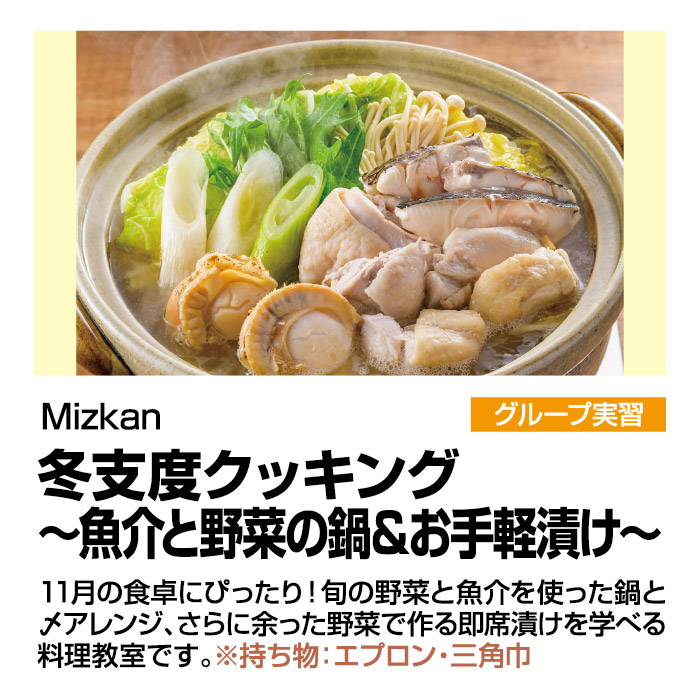 講座内容:旬の野菜と魚介を使った“あったか鍋”の魅力を楽しむ料理教室です。最後まで美味しく味わえる〆アレンジもご紹介。さらに鍋で使った野菜の残りを活用して、簡単にできる即席漬けのアイデアも学べます。旬を味わいながら無駄なく使い切る工夫で、家庭の食卓をもっと豊かに彩りましょう。※持ち物:エプロン・三角巾