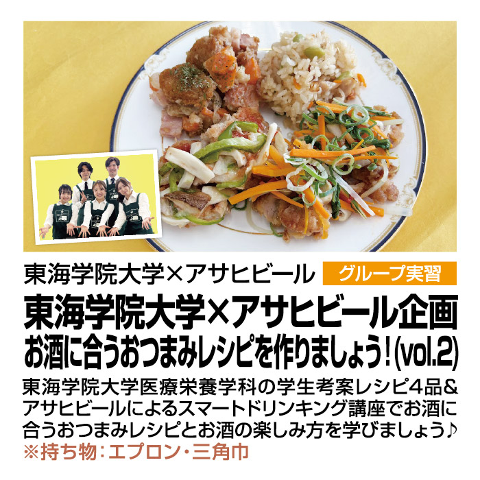 講座内容:東海学院大学管理栄養学科の学生考案レシピ4品のワンプレート&アサヒビールによるスマートドリンキング講座でお酒に合うおつまみレシピとお酒の楽しみ方を学びましょう♪ ※持ち物:エプロン、三角巾 ※お酒に関する内容の為、20歳以上とさせていただきます。