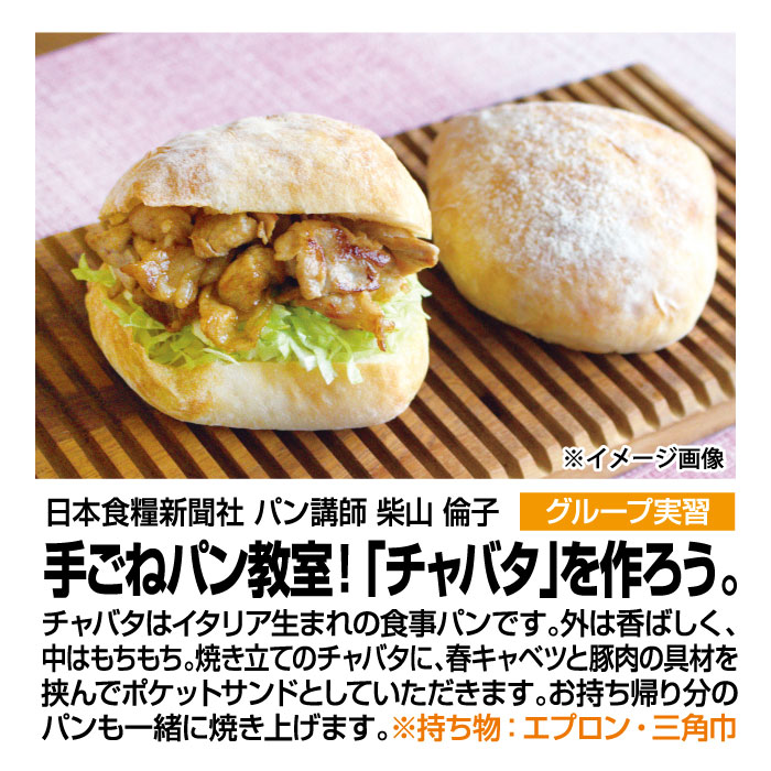 講座内容:チャバタはイタリア生まれの食事パンです。外は香ばしく、中はもちもち。焼き立てのチャバタに、春キャベツと豚肉の具材を挟んでポケットサンドとしていただきます。お持ち帰り分のパンも一緒に焼き上げます。※持ち物:エプロン・三角巾