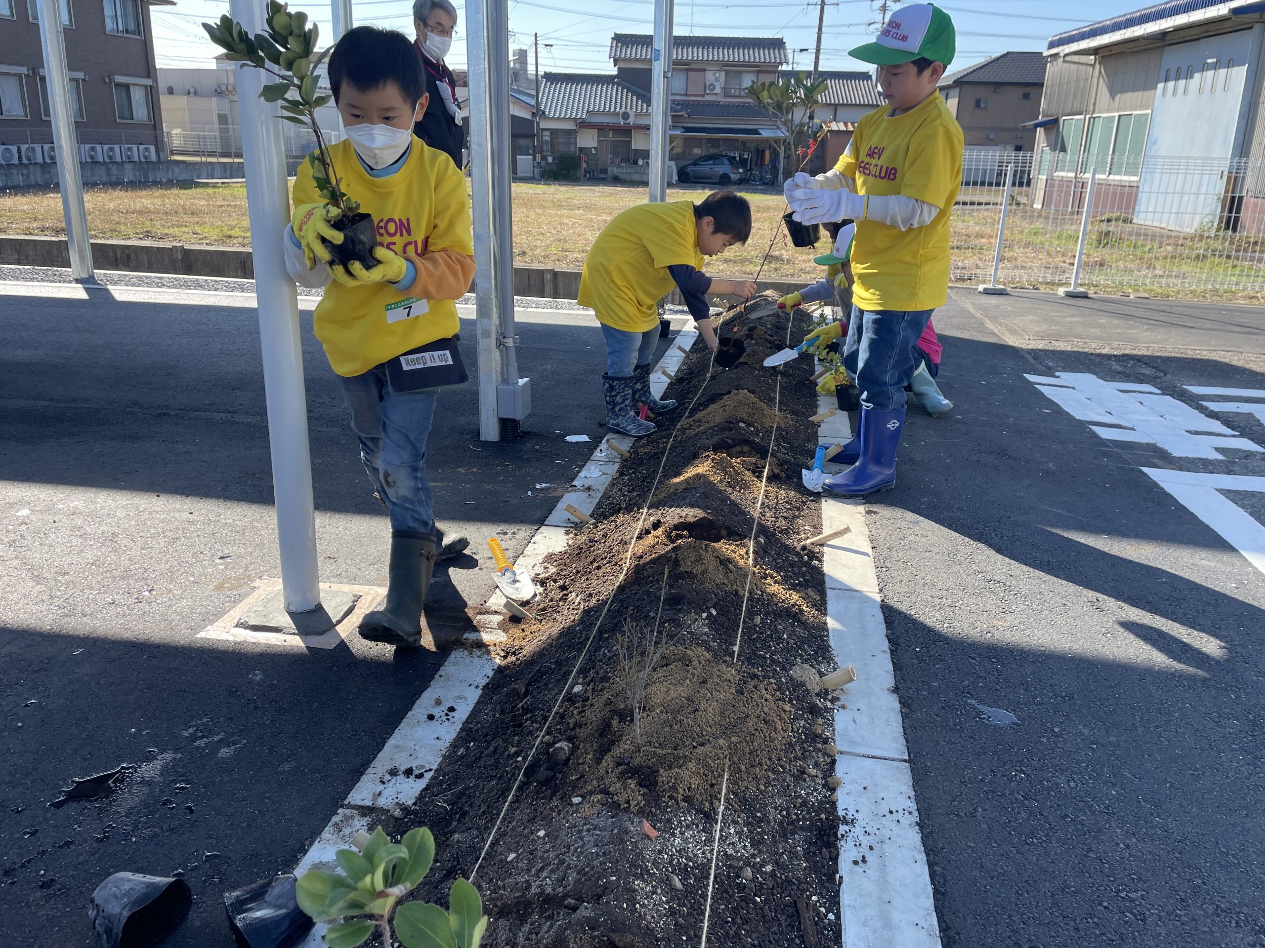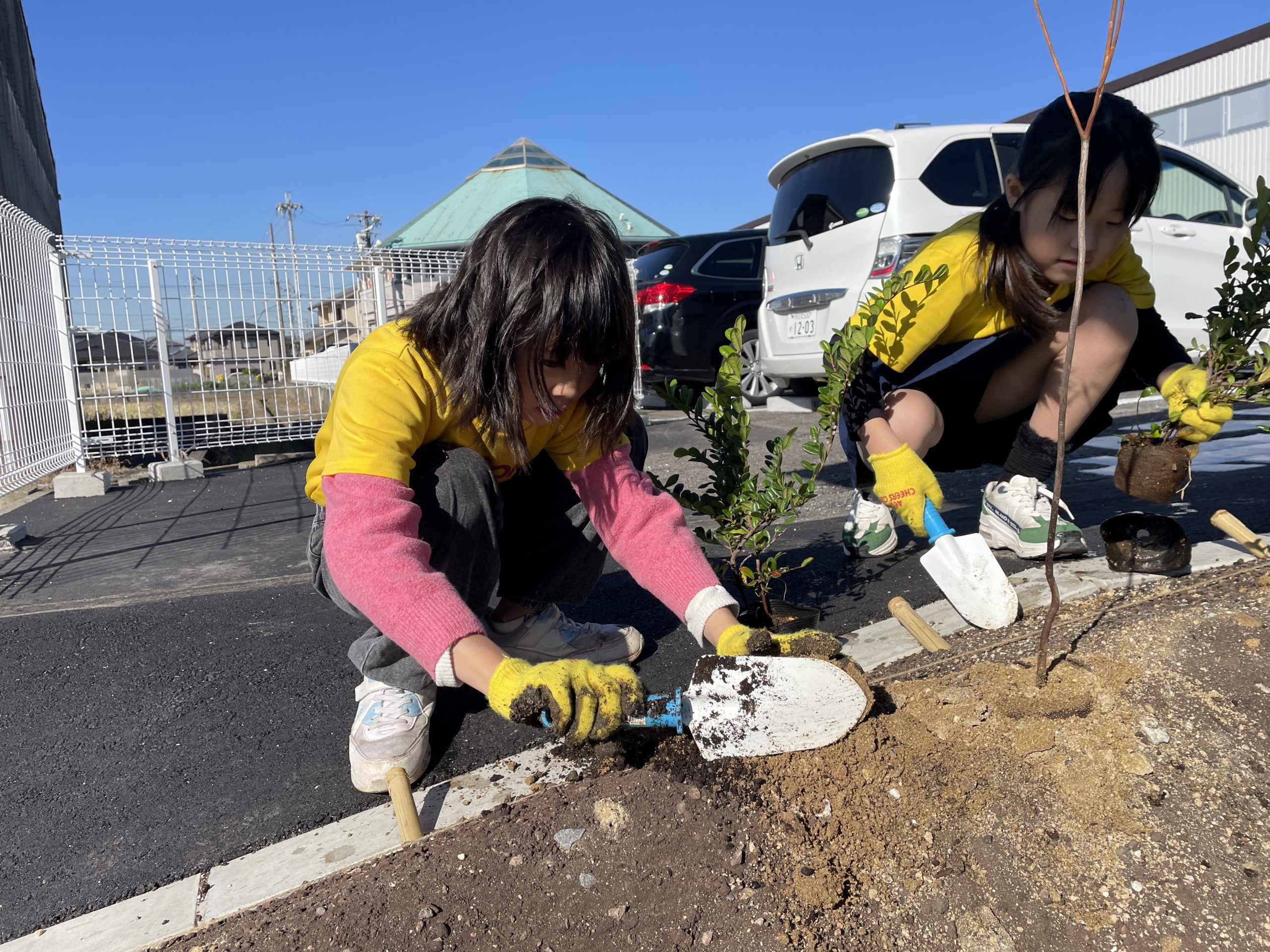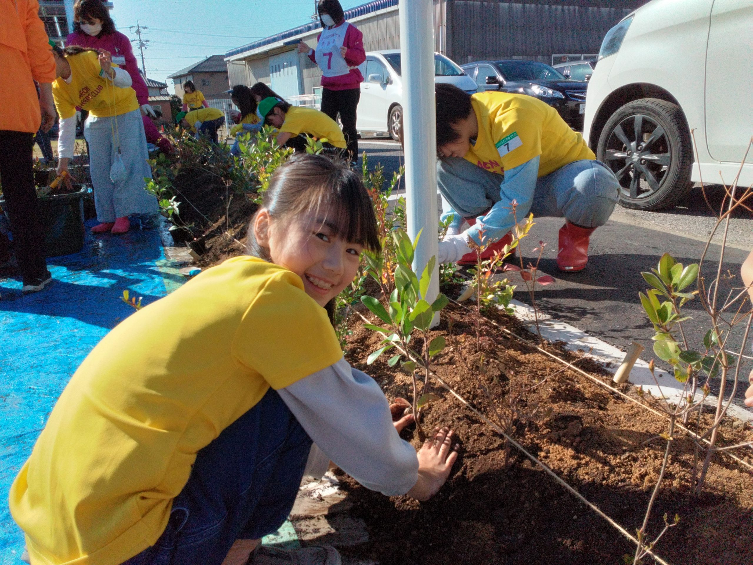 マックスバリュ高浜呉竹店植樹祭に参加し、苗木の植え方の説明と植樹をしました。たくさんの参加者の前で苗木の植え方を説明したので緊張しました。植樹は小さな苗木の赤ちゃんを優しく持って植え、寒さや乾燥から守るためにわらを敷き詰めました。元気にすくすくと大きく成長して欲しいです。