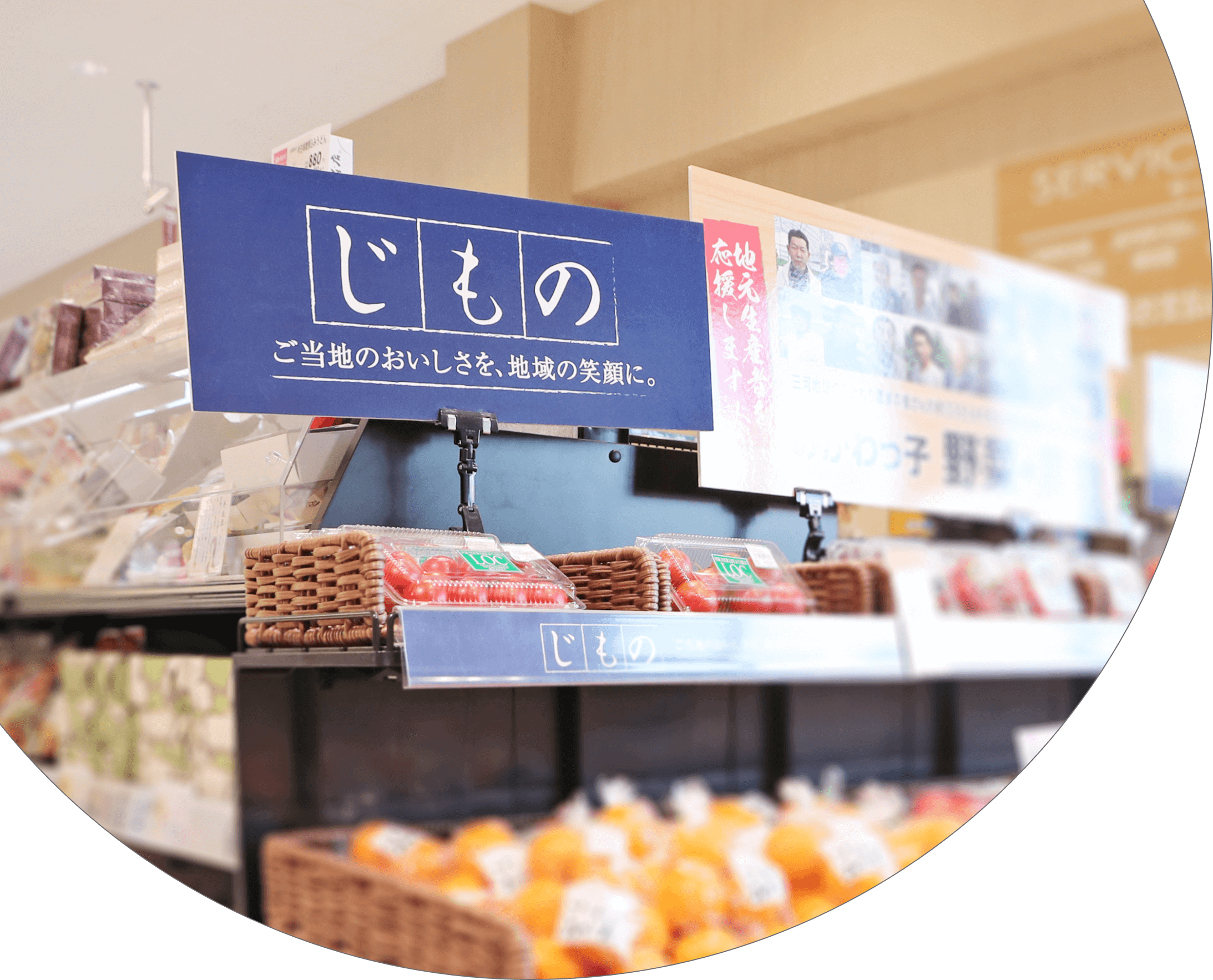 地域ならではの食材や食文化は、その土地のかけがえのない宝物です。マックスバリュ東海は、それぞれの地域に根差したじもの商品の販売やレシピ提案、あるいは地元のお店とのコラボによる商品開発など、多角的な取組みを実施しています。コロナ禍においては需要が減少した生産者さまを応援するために、じもの応援セールを開催し、地域の活性化に努めました。